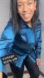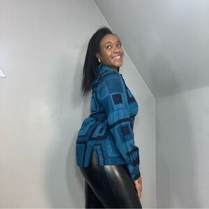 Fun geometric shades of turquoise and navy blue. Zip back. Dual buttons at cuff.