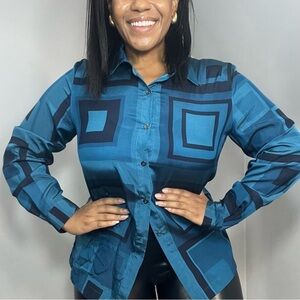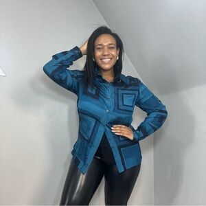 Vintage Doncaster blue geometric 100% silk blouse groovy retro 70s disco top