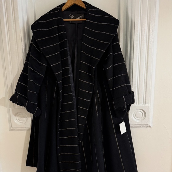 Beautiful 1950’s vintage wool coat from Donenfeld’s Ohio. Has a shawl style, 3/4 sleeves, pockets and metallic x-stitching in a striped pattern. Bought from Golyester in LA for $899 and never worn - tags still attached.