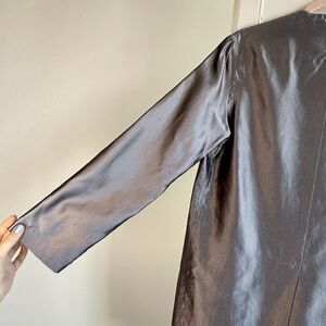 This fabulous vintage piece from famed NYC designer Donna Karan's archival runway collection is both a timeless classic and rather modern and futuristic, minimalistic and glam - fabricated in shiny gunmetal silver pure silk. It makes an excellent overcoat for evening wear, but will look just as chic and sleek layered over a lacy camisole and straight leg pants. The material has so much depth and shine! Perfect for the upcoming holiday party season.