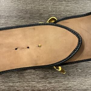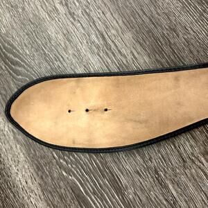 The belt shows expected vintage wear that does not affect functionality. There are surface marks and small indentations on the leather, interior leather wear from normal use, and minor scratches on the gold buckle. Please see all photos for accurate condition.