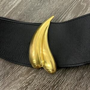 vintage Donna Karan New York black leather belt featuring iconic sculptural gold buckle. Made in Italy of smooth genuine leather and a curved waist-cinching silhouette. abstract gold buckle creates a dramatic focal point and hooks securely into the interior stud.