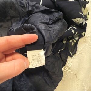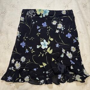 Timeless and elegant, this vintage Donna Ricco New York dress features a flattering midi length and classic 90s/early Y2K silhouette. The soft black fabric is adorned with delicate blue, white, and green floral patterns, finished with a subtle ruffled hemline for added charm. Fully lined with a hidden side zipper, this size 8P piece is ideal for garden parties, weddings, or vintage lovers looking for a feminine, polished look.