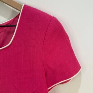 Vintage 1970's Donna Ricco short sleeve sheath dress in a vibrant pink/fuchsia with crisp white boning detail & structured shoulder pads. Features a flattering scoop neckline, front pockets, and a fitted silhouette that channels the elegance of a classic Mad Men era look. Perfect for retro events, cocktail parties, or collectors of mid-century fashion.