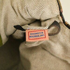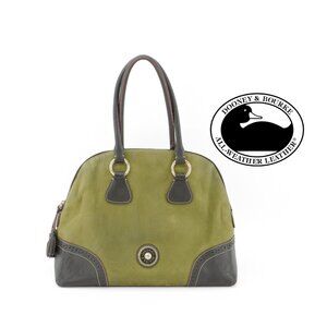 THis is a medium to large size bag. Chic vintage Dooney & Bourke satchel bag in a stylish olive green and chocolate brown color combination. Crafted from signature All-Weather Leather, this versatile handbag features a classic dome shape, top handles, and a secure zip-top closure. Perfect for everyday use, it adds a touch of retro elegance to any outfit. Excellent pre-loved condition, showcasing the durability and timeless appeal of Dooney & Bourke craftsmanship.