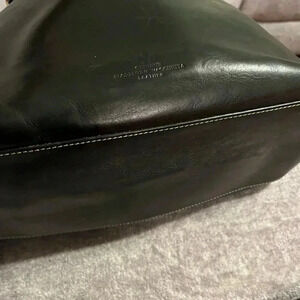 Dooney &Bourke genuine leather. Gorgeous bag! Fantastic condition. One spot on the inside bottom canvas. Otherwise pristine. Has attached card holder and key clip. Gorgeous!! Deep chocolate color, almost black. Has gold hardware. This bag will last forever!!