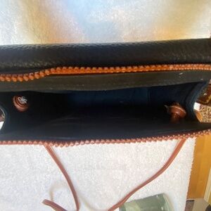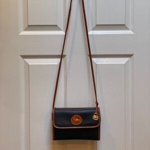 Vintage Dooney & Bourke Black Handbag. In Good Pre Owned Condition. Crossbody or Shoulder Bag. 9 Inches Long, 6 Inches Tall. Top Zip, Strap Drop 24 Inches. Two Inside Zip Compartments, Inside Credit Card Holder. Pen Holder & Inside Mirror.