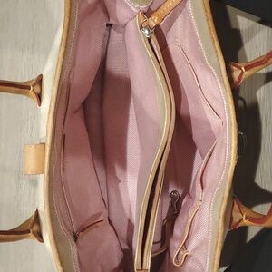 Vintage Dooney & Bourke Canvas Logo Signature Bag. Fair used condition. The interior is in pretty good shape, but there is wear and some staining on the bottom of the bag and the leather is worn on the handles and corners. Pictures show the worn leather and staining on bottom of the bag.