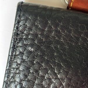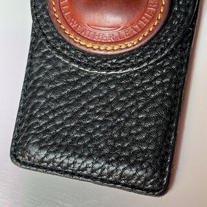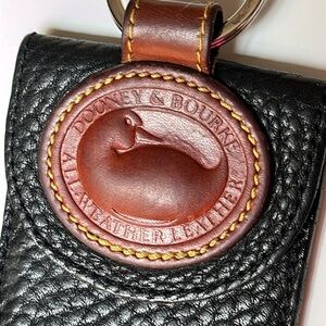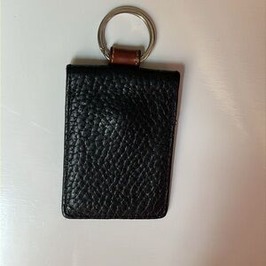 Dooney & Bourke vintage black brown leather card holder key ring holder. In overall good condition. Key ring has some discoloration. White spot on back. Edges show some leather wear.