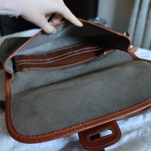 Vintage Dooney and Bourke Equestrian crossbody in Grey Pebble All-Weather Leather with Tan trim. In good condition with signs of wear. Loose threads on D&B logo (logo is secure) and one small stain on the bottom (see last two photos). I have not tried cleaning!