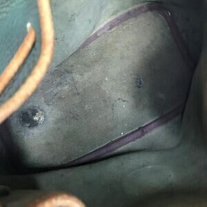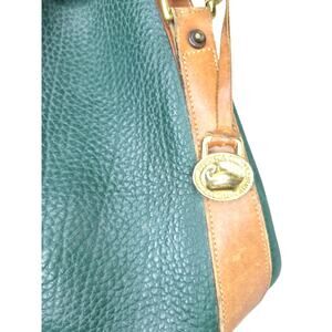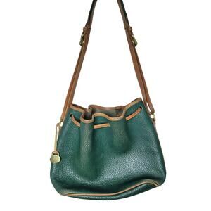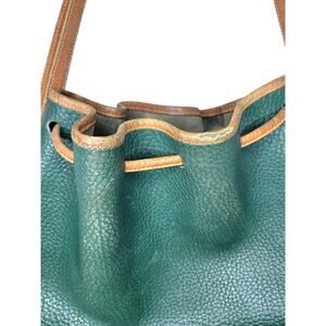 Vintage 90’s fir green and tan Dooney and Bourke shoulder drawstring bucket bag. Not perfect but in good shape for age. Flaws are shown & pictured. Great leather bag. They truly do not make them like they used to.