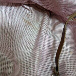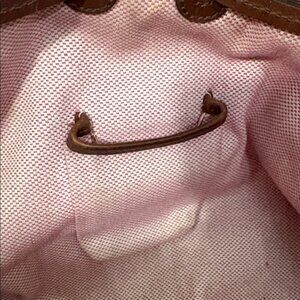 Interior has two compartments separated by a zipper compartment. Zipper pocket, lobster claw hook, and small cell phone pocket which indicates and older model of this bag.