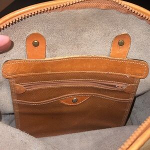 Elegant Dooney & Bourke satchel in a stylish beige and brown color. Really good vintage condition, some small scratches to the side, some distressing to handles but in really good cond for age, tan color on body, cognac brown trim and handles, no cross body strap only attached shoulder straps, zipper works well! Internal pockets and leather in great condition, no holes or major wear.