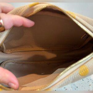 Color: Tan with Golden Yellow Polka Dots and Brown Leather