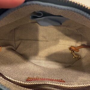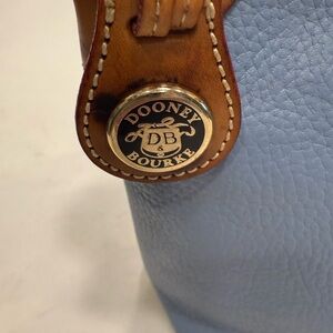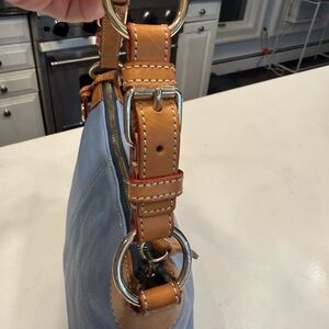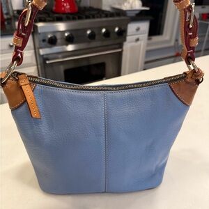 Excellent condition. Dooney & Bourke sky blue small leather shoulder bag with tan leather trim. Zip close, bag charm, inside zip pocket & slip pocket, tan canvas interior.