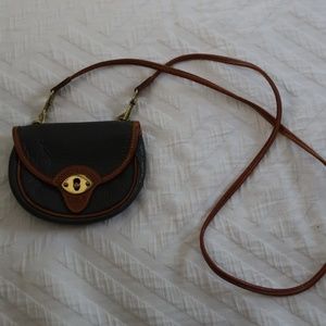 Cute vintage crossbody from Dooney & Bourke. Small saddle bag style in pebble gray leather with tan trim and gold/brass front closure. Includes original tan strap. Minimal wear, no major flaws.