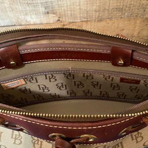 Vintage Dooney & Bourke Tan Signature Jacquard Small structured Hobo Bag with brown leather dual handles and trim, secure zip top, 2 inner slip pockets. Light wear shows only on top of handles and bottom corners of bag, and a few minor discolorations in the interior of the bag. See photos for details. Measures 13" L X 6" H X 3.5" D. 9.5" Handle drop. Leather tabs on each side of zipper could support a cross body strap, but none is included.