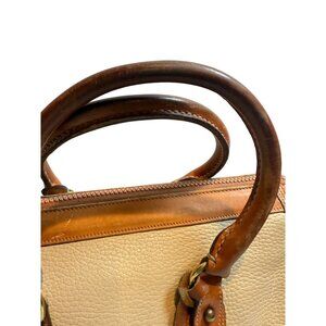 Vtg. Dooney & Bourke Two Tone Taupe Saddle Pebble Leather Doctor Satchel Bag. This Dooney & Bourke handbag offers a classic style with its all-weather leather build. Featuring durable brass accents and a secure zipper closure.