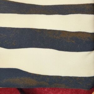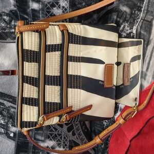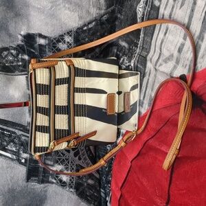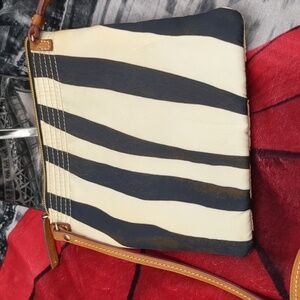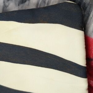 Black and white animal print canvas bag with red interior zipper top. strap is in great condition. please note discoloration in the black areas are brownish. this has been cleaned but the discoloration still remains please refer to pics and ask questions prior to purchase. approximate dimensions are 8 in in height by 7 and 1/2 in in length. strap drop is 24 in can be made longer or shorter.