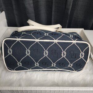 Vintage Dooney and Bourke nautical knot print east/west bucket bag in black with white leather trim.