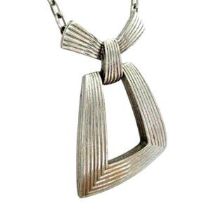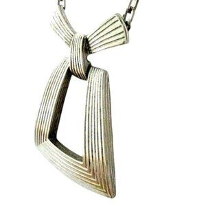 Elegant piece with a unique abstract design, this vintage silver tone necklace enhances any ensemble. It features a bold geometric pendant.