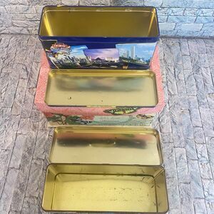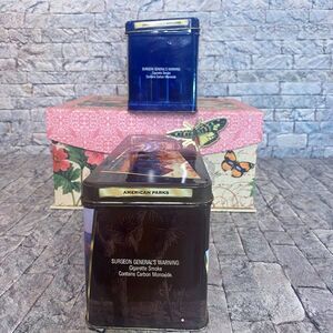 Each tin size is: 10" Length, 4-1/2" Height, 3-3/4" Width. Originally held a carton of cigarettes (10 Packs). These do have some wear to them. Please inspect pictures carefully before purchasing. The lid for the blue one is comes completely off.