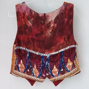 Bold artsy abstract print in reds, oranges, and golds with pops of blue. Ornate pearlized buttons, pointed hem, and a patterned back make this a true statement piece.