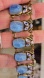 Beautiful blue glass faux star sapphire high domed cabochons are each accented with dot and leaf pattern blue and white enamel leaves in this brass link style bracelet.