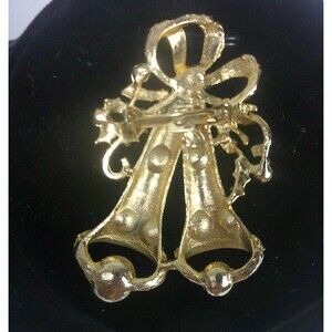 Vintage Double Bell Christmas Gold Tone Brooch Holiday Pin 2 Inch Red Green