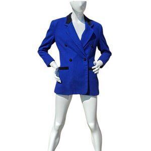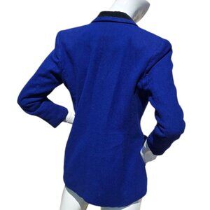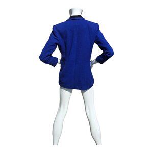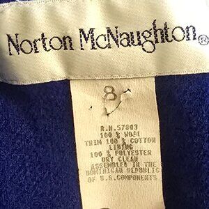 Vintage blue wool blazer by NORTON McNAUGHTON. Double breasted with black velvet collar, buttons & pocket detail. Fully lined. Used vintage condition. No holes or stains. The black pocket detail on the right pocket needs a couple of stitches (I am out of black thread ๐ )
