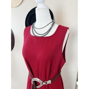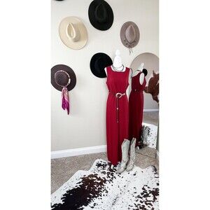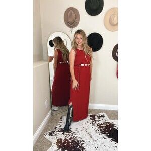 This is a genuine treasure, a beautiful maxi length slip on red dress. It has a side slit, approximately 16". This would be a perfect dress for a country concert or dress it up for the NFR! The garment is in excellent vintage condition (no rips, holes or stains). Measurements available in photos. Belt and Boots not included.