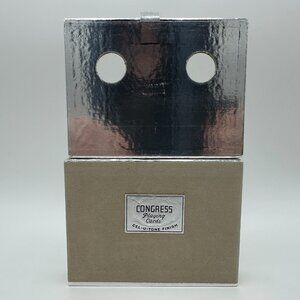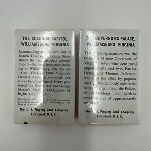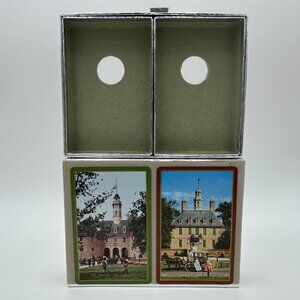 This is a vintage Congress Playing Cards double deck set featuring artwork from Colonial Williamsburg in Virginia. The set has a deck with art of The Capitol and a deck with art of The Governor's Palace. Both decks are still sealed in the original packaging. The drawer box that they are stored in is not sealed. They are overall in excellent condition with only a few marks of wear to the drawer box. There are some minor marks on the Congress sticker, and a few other light marks that are on the velvety material that the box is made out of. All of these flaws are shown in the photos. Nothing major. Other than that, they are in great shape. These come from a smoke free and pet free home and will be packaged and shipped with great care.