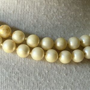 Vintage Double Strand Hand Tied Faux Pearl Necklace with Rhinestone Clasp. Some patina on the clasp.