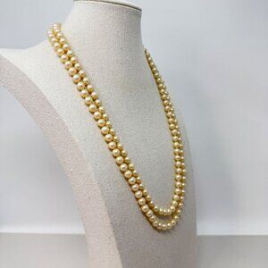 This elegant vintage double strand necklace features imitation pearls with a silver-tone ornate clasp, perfect for adding a touch of sophistication to any outfit. Its timeless design makes it suitable for various occasions.