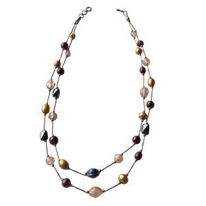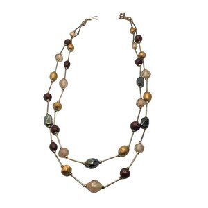 Vintage Double Strand Necklace Mixed Beads Silver Green Gold Purple Adjustable L