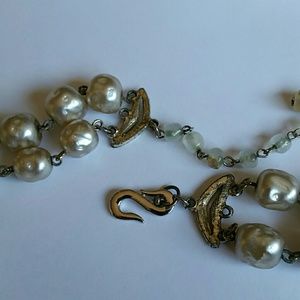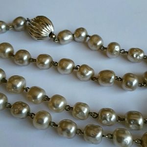 Fashioned in muted silvers with hook clasp. Top strand measures at 23" bottom strand measures 26" extended length of 3". Being a vintage piece it is not perfect. It is missing a middle third strand. That big said it is still a very lovely piece.