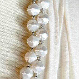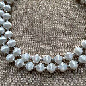 This vintage necklace showcases a double strand of lustrous faux satin pearls accented with silver-tone beads. Adjustable clasp with hook ensures a comfortable fit.