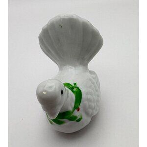 This vintage ceramic dove christmas ornament features a delicate holly accent painted around neck, capturing a timeless elegance. Its elegant design adds a unique charm to holiday attire. The intricate detailing of the dove and its subtle color palette evoke nostalgia, making it a cherished piece for collectors or those appreciating vintage aesthetics. Clip on attaches to tree branches.