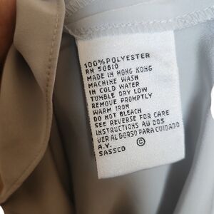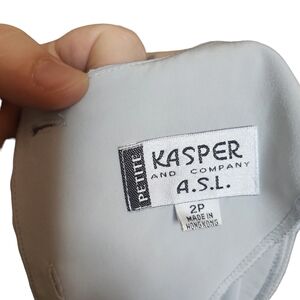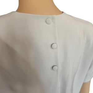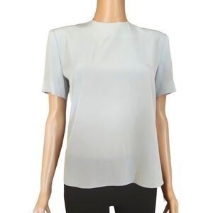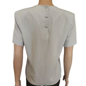 This is a lovely shell in a beautiful pale blue-grey color - the last picture is a good representation of the color. This shirt has no stains or issues, and the button detail in the back is lovely!
