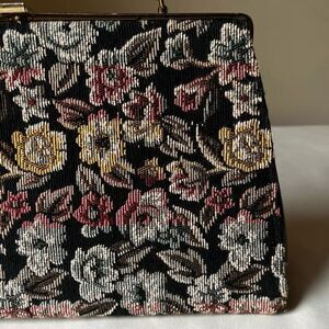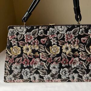 vintage tapestry handbag, floral carpet bag, structured top handle bag, framed purse gold hardware, 60s 70s retro handbag, dark floral handbag, cottagecore purse, granny chic style bag, made in USA handbag, Dover tapestry bag
