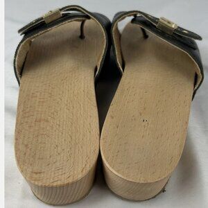 Vintage Dr Scholls Black Toe Loop Wooden Leather Sandals Clogs Womens 9 Rare