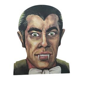 Sink your fangs into this terrifyingly awesome vintage cardboard vampire decoration! With haunting green eyes, dramatic brows, and classic Bela Lugosi-style fangs, this guy is ready to stare down trick-or-treaters and creep out party guests all October long.