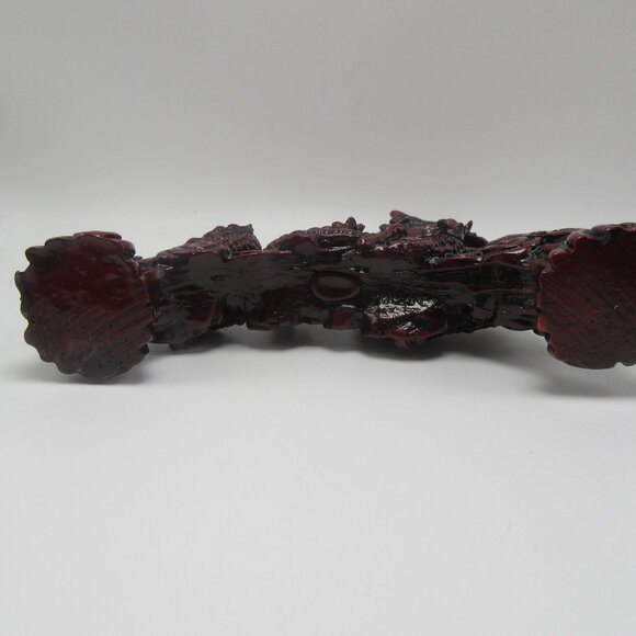 Nice statue is appx.7 1/2 inches long and 4 1/2 inches tall and weighs around 1 pound. It is made of a resin with a red/brown glaze made to look like cinnabar. Piece is in excellent condition with no markings.