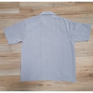 This Vintage Dragonfly Clothing shirt is a men's gray/black button-up shirt with a geometric dragonfly pattern, short sleeves, and a collared neckline. Made from lightweight polyester fabric, it features embroidered accents and a retro 90s tribal design. The shirt is machine washable and has a regular fit, making it perfect for casual occasions during the summer, fall, and spring seasons.