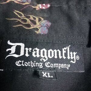 Vintage Dragonfly Flaming Dice Pearl Snap Button Shirt - Size X-Large, Measures p2p=25" Length=31" Sleeve Length=25" - Excellent Condition, No Flaws - Black Color Shirt