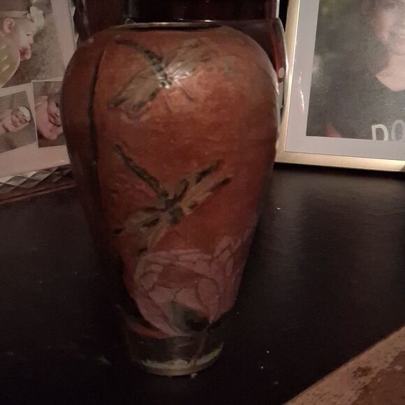 Enhance your home decor with this elegant brown vase featuring a beautiful dragonfly design. Perfect for adding a touch of nature to any room.