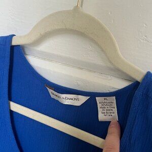 Polyester and rayon. Textured. Lightweight material for summer. Petite Large.
