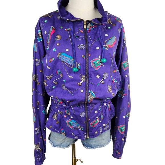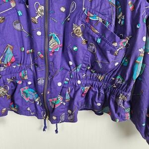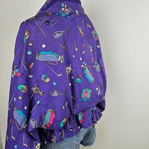 Key features: purple with fun, quirky sports theme print - golf bag, tennis, badminton, croquet, bocce ball, trophy - full zip front, long sleeve, drawstring waist with a little peplum hem, small slant pockets