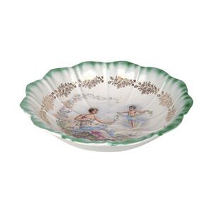 Enhance your home with the delicate elegance of this vintage Dresden china bowl. The cream-colored bowl showcases a beautifully painted scene of a woman and angel, adorned with a graceful green trim and accented with gold gilt.