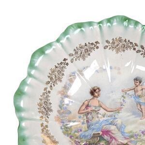 Vintage Dresden Porcelain Bowl: Woman and Angel Motif, Green & Gold Trim
